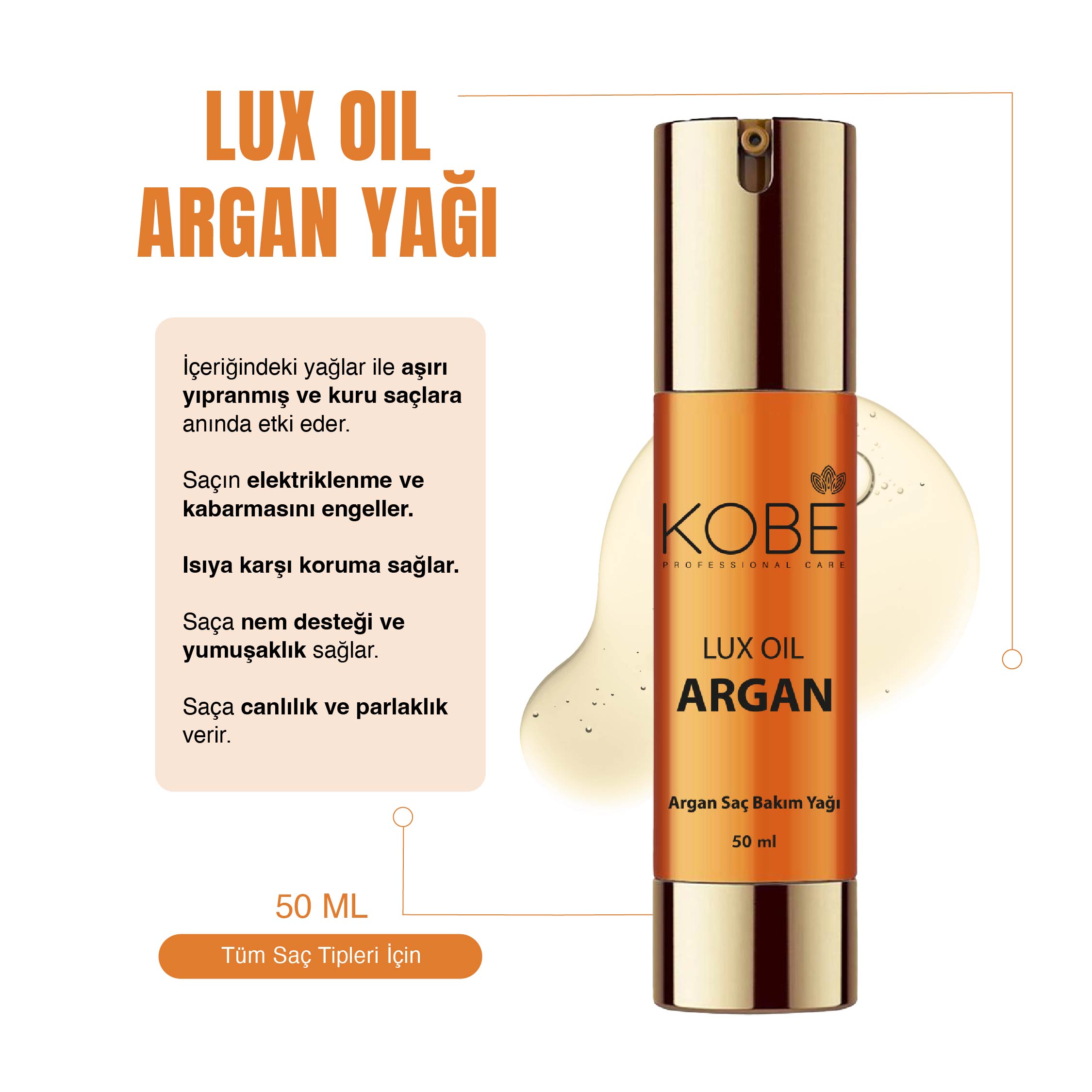 Kullanımı: Lux Oil Argan Saç Bakım Yağını avuç içine ufak bir miktar alıp ovaladıktan sonra ıslak veya nemli saça eşit miktarda uygulayınız, durulama gerektirmez.